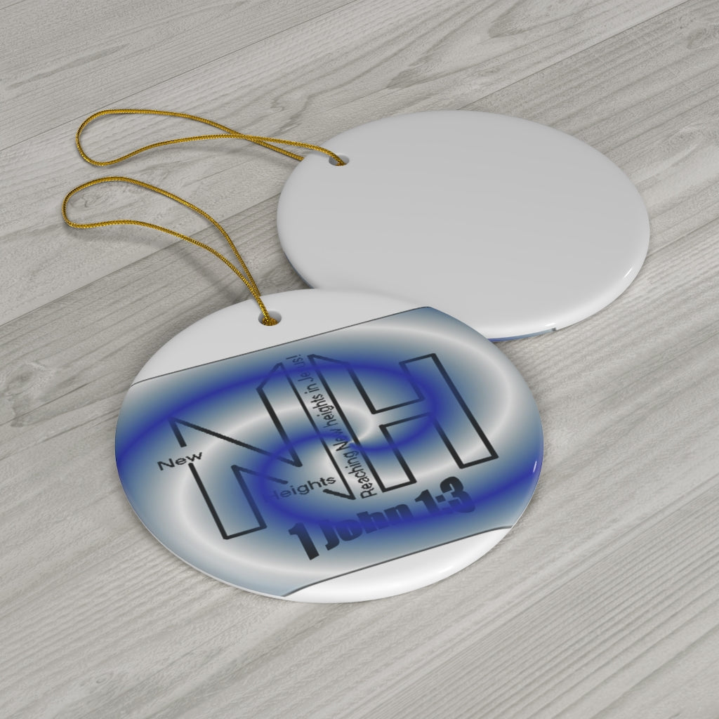 New in Jesus ornament. It's round, has the new heights logo on front and a spiral blue background. A reminder year after year to grow in the Lord at a time when business can interfere with remembering that we celebrate this season because Jesus came to earth. NOTE: Each pack contains a single ornament.
