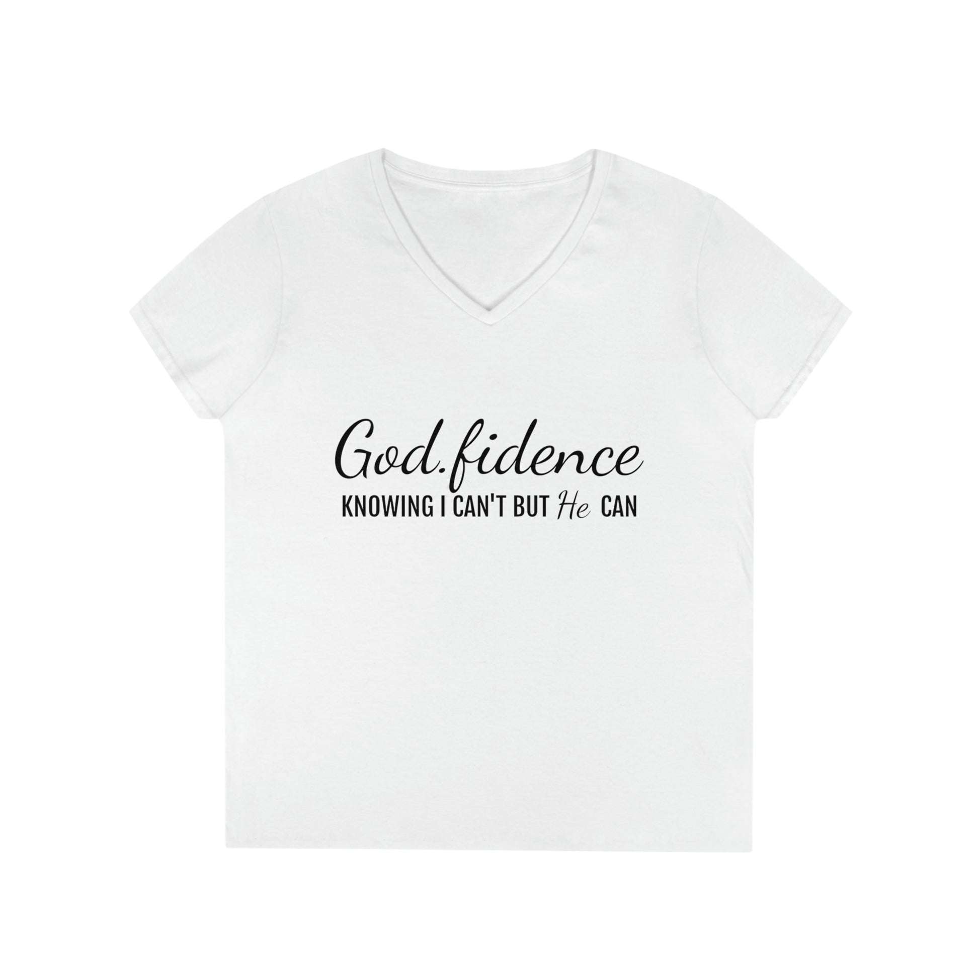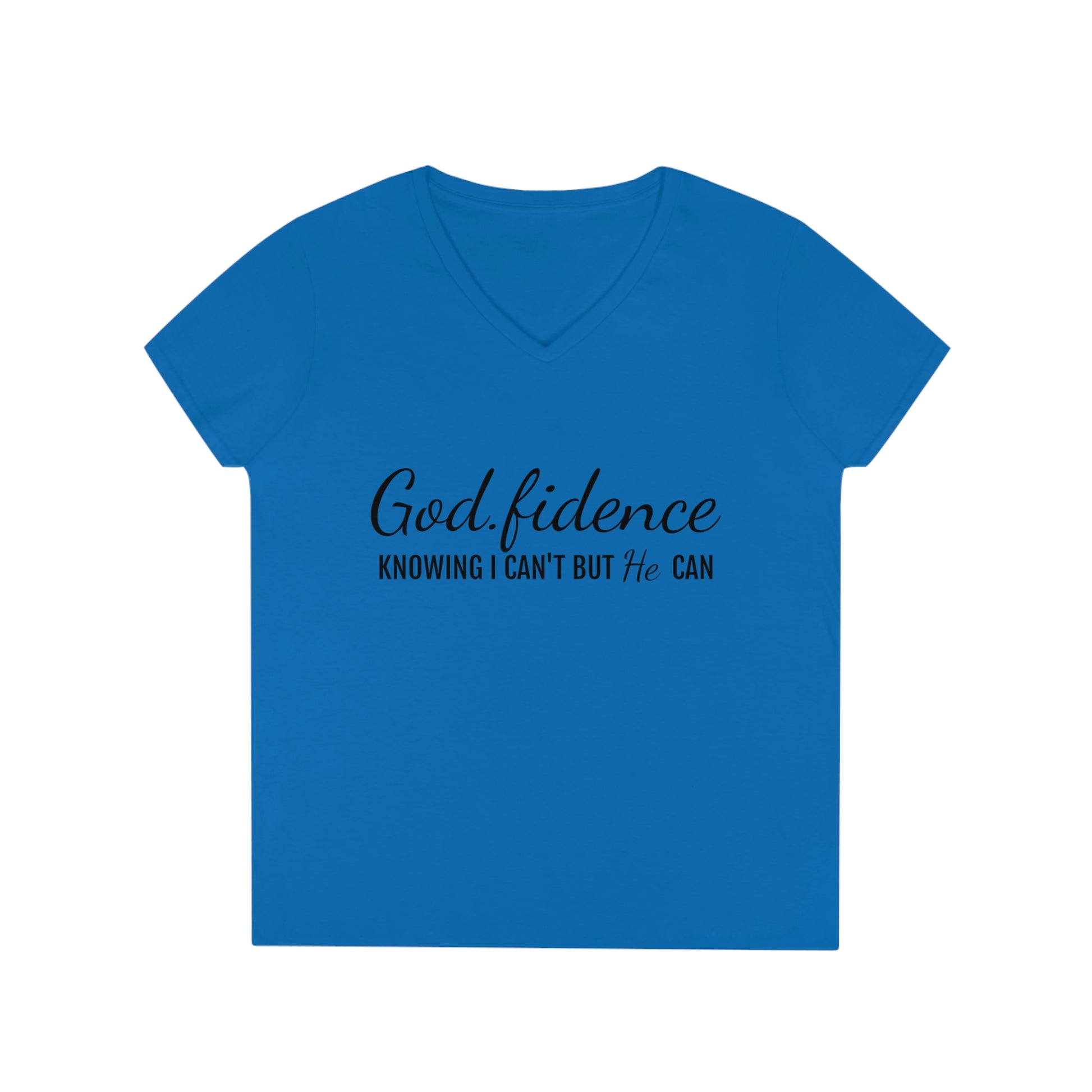 These v-necks read God.fidence Knowing I can't but He can. Made from 100% cotton, the classic midweight fabric serves as a printing canvas for your unique designs.