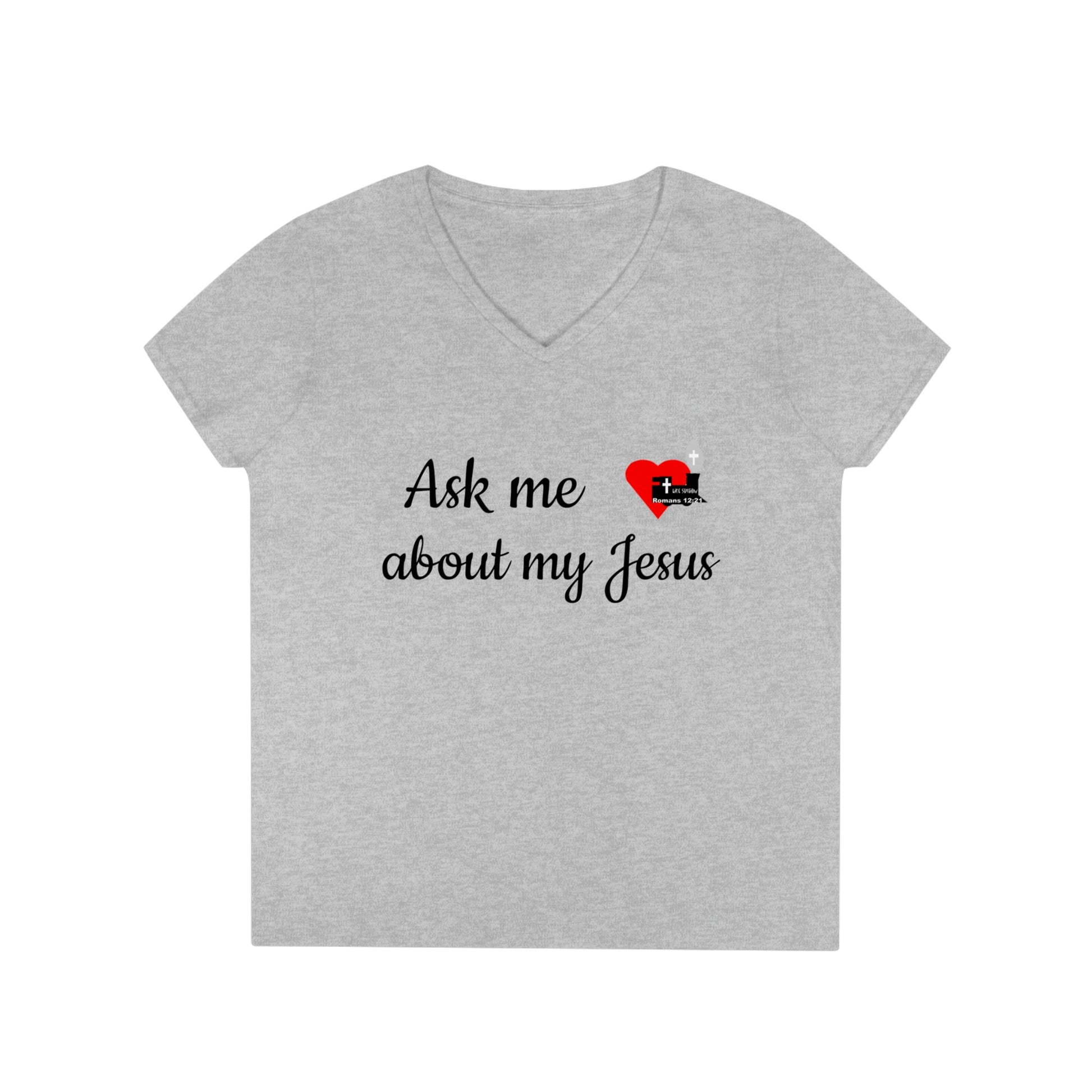 Spread the good news with this LifeStation logo v-neck tshirt reading "Ask me about my Jesus". These v-necks are made from 100% cotton with