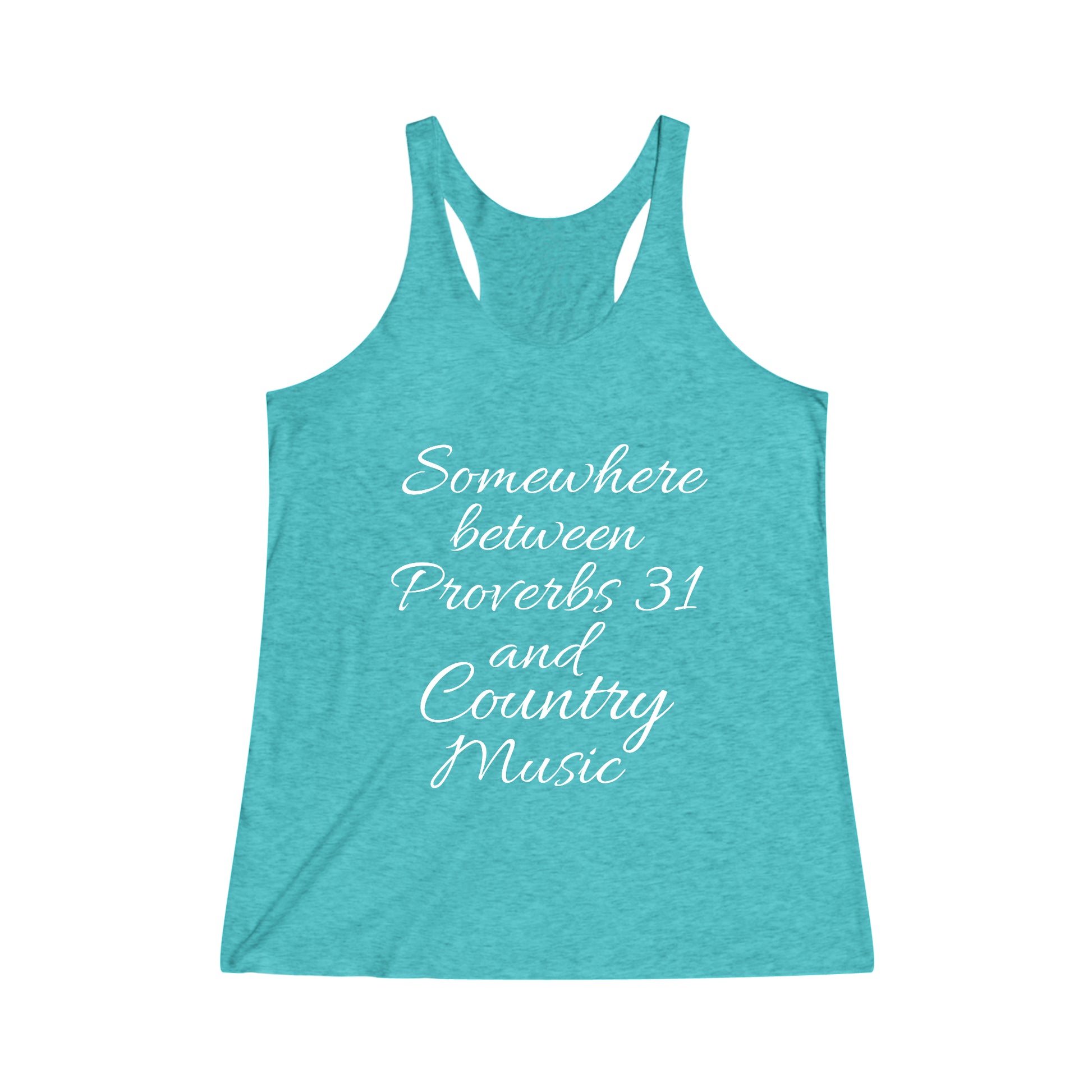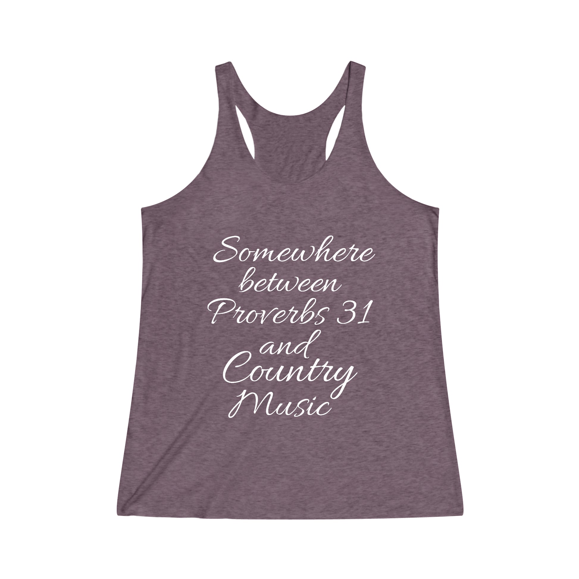 Somewhere Between Proverbs 31 and Country Music Women's Tri-Blend Racerback Tank