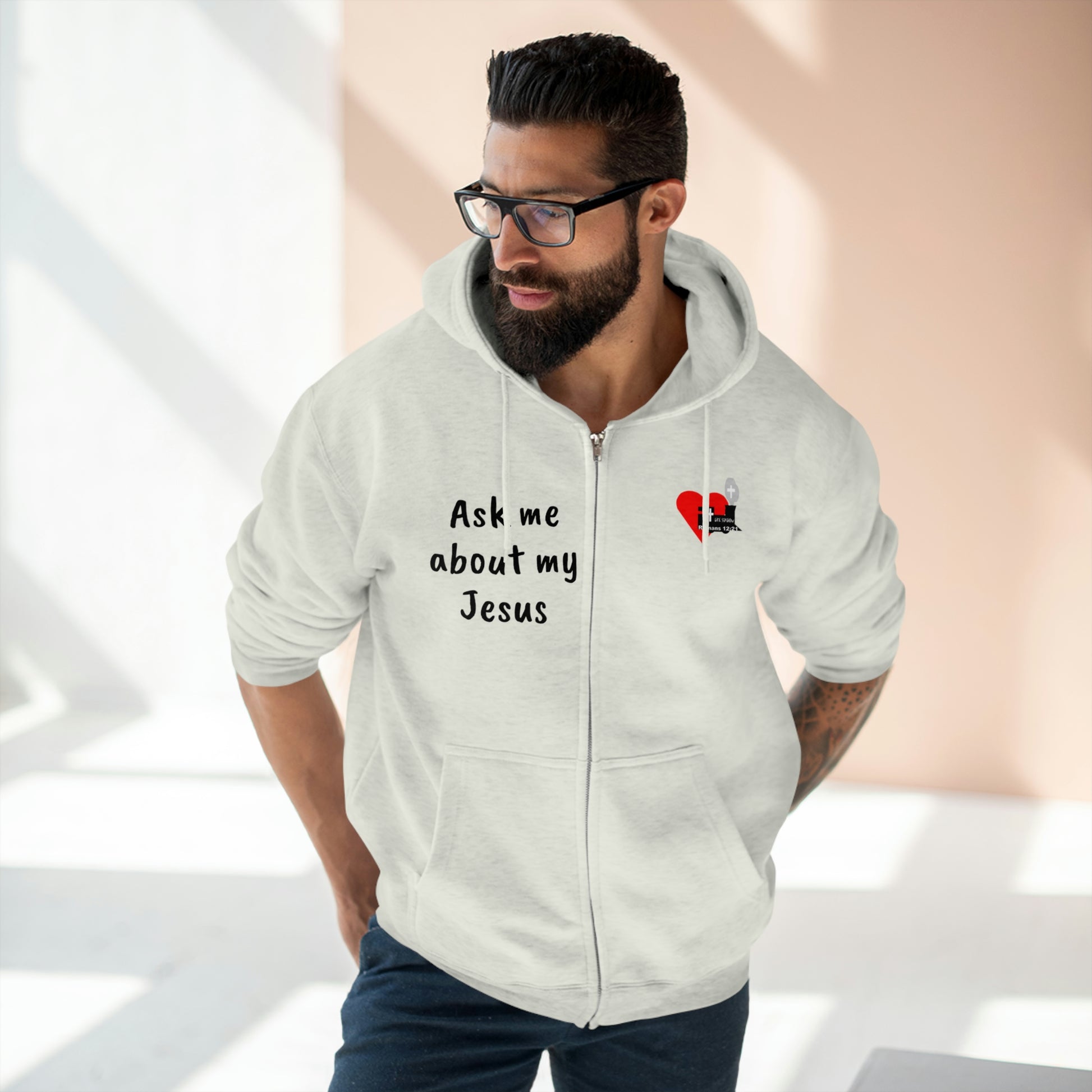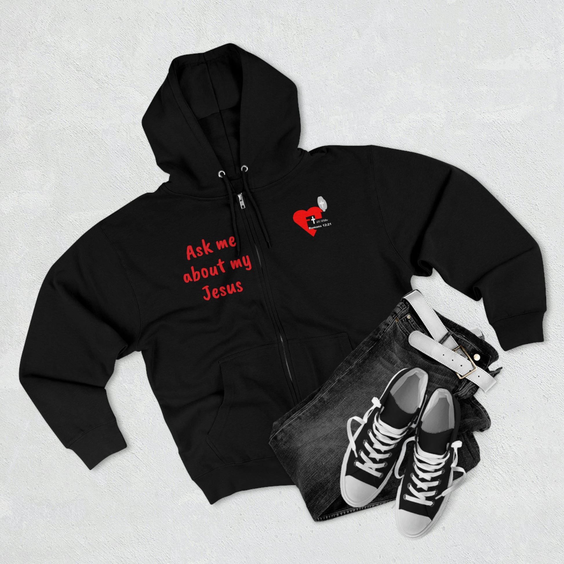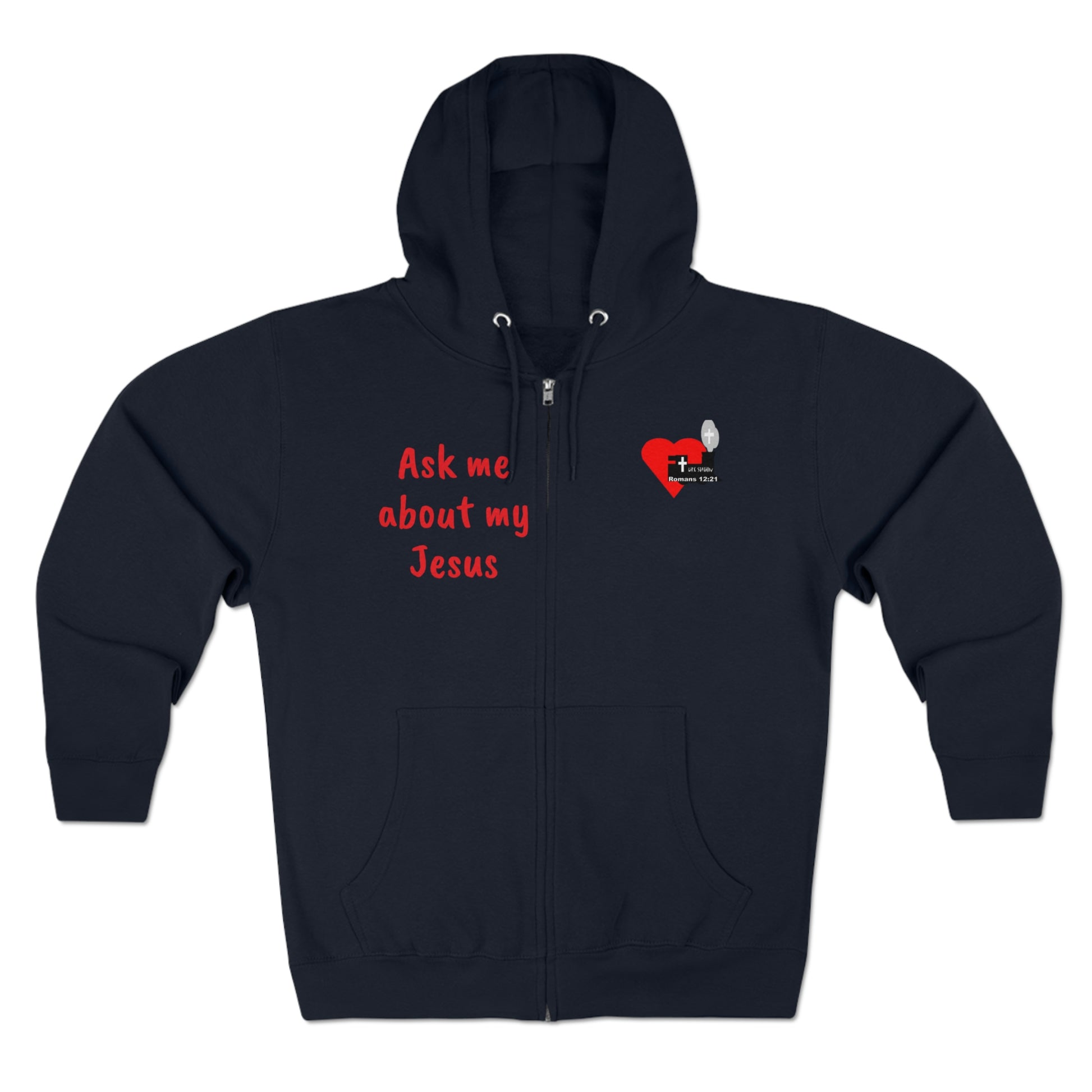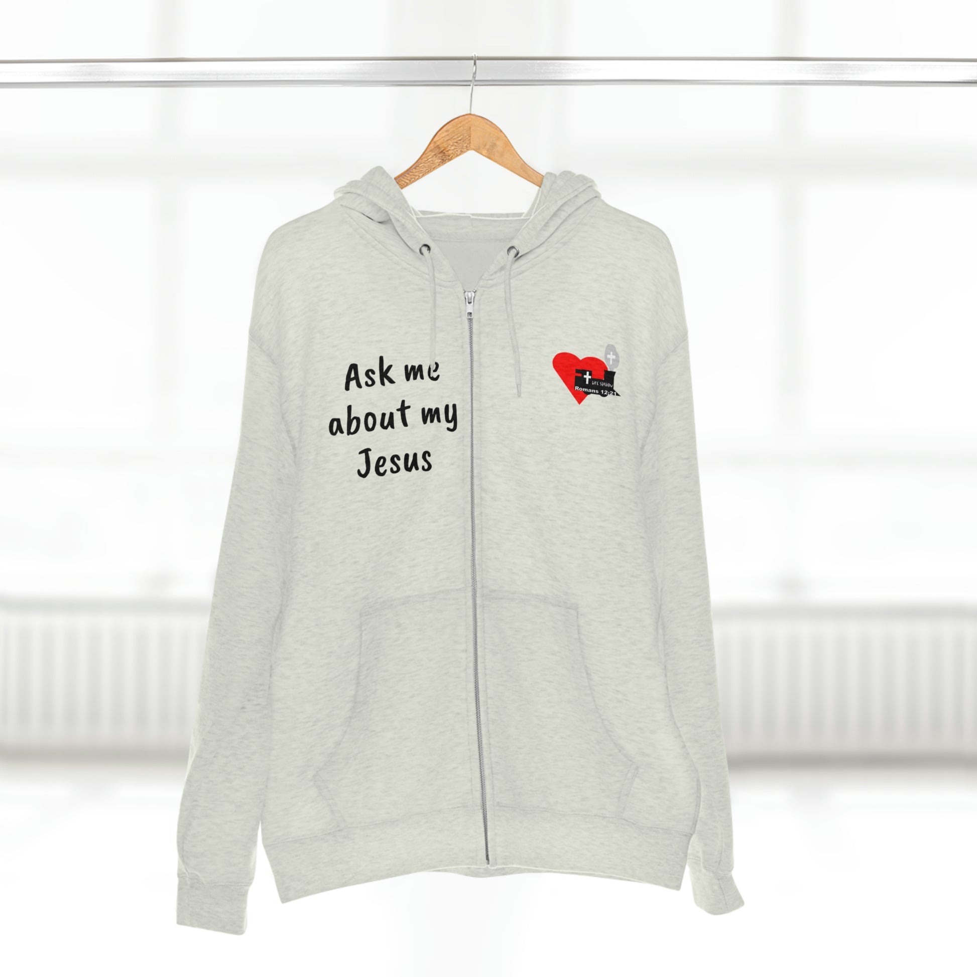 Spread the good news with this LifeStation logo hoodie reading "Ask me about my Jesus". Zip hoodie is warm, comfy and soft to the touch, and treated for less than 5% shrinkage.